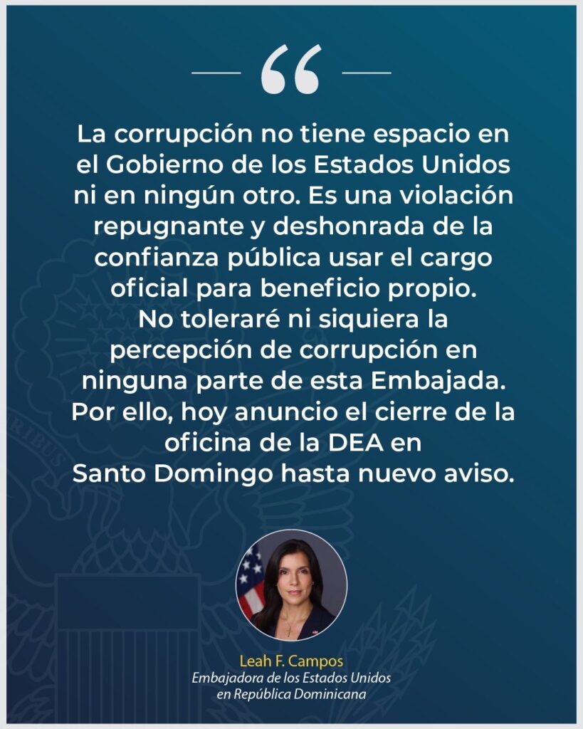 Santo Domingo.– La embajadora de los Estados Unidos en República Dominicana, Leah F. Campos, anunció este jueves el cierre indefinido de la oficina de la Administración para el Control de Drogas (DEA, por sus siglas en inglés) ubicada en Santo Domingo, como parte de una política de tolerancia cero frente a cualquier indicio de corrupción dentro de la misión estadounidense en el país caribeño.