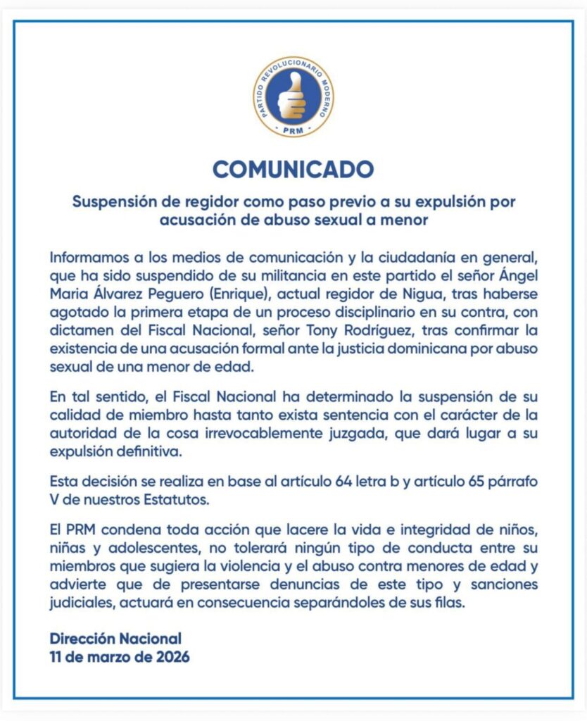 Santo Domingo.– El Partido Revolucionario Moderno (PRM) informó la suspensión de la militancia del regidor de Nigua, Ángel María Álvarez Peguero (Enrique), luego de que se confirmara la existencia de una acusación formal ante la justicia dominicana por presunto abuso sexual contra una menor de edad.